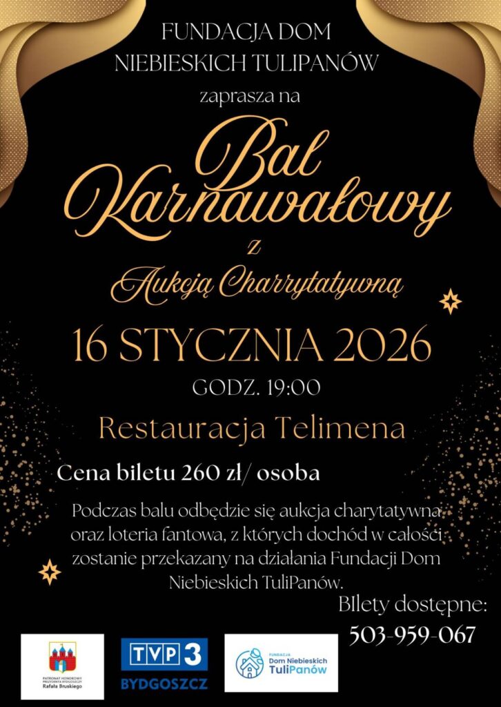 – Fundacja Dom Niebieskich TuliPanów zaprasza na wyjątkowy Bal Karnawałowy z Aukcją Charytatywną, który odbędzie się 16 stycznia 2026r o godzinie 19:00 w Restauracji Telimena w Bydgoszczy. Wydarzenie będzie nie tylko okazją do wspólnej, eleganckiej zabawy w karnawałowym klimacie, ale także do realnego wsparcia ważnego celu społecznego. Podczas balu zaplanowano aukcję charytatywną, w ramach której będą licytowane unikatowe przedmioty oraz vouchery przekazane przez darczyńców. Dodatkową atrakcją będzie loteria fantowa, przygotowana specjalnie dla uczestników wydarzenia – zachęcają jego organizatorzy.