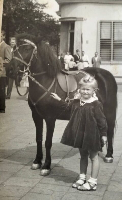 Jego kilkuletnia wówczas siostra ma także portret na kucyku. W tle widać charakterystyczne półokrągłe wejście do kamienicy przy Pl. Wolności 1, zaprojektowanej przez Józefa Święcickiego. Trudno je od razu rozpoznać – bardzo się różni od współczesnego. W tej jednej z najpiękniejszych kamienic z Bydgoszczy znajduje się obecnie restauracja Manekin, wcześniej był Mc Donald’s, a przez dziesięciolecia w PRL działały tam ekskluzywne „Delikatesy”.