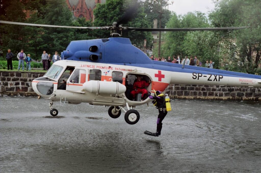 – W Bydgoszczy organizowaliśmy wtedy jako pierwsi w Polsce dyżury lotnicze pogotowia i lataliśmy do wypadków. Przechodziliśmy specjalistyczne kursy, organizowane między innymi przez fachowców z TOPR, którzy uczyli nas technik wysokościowych i desantów na linie. To było niesamowite doświadczenie. To z tego czasu pochodzi znane zdjęcie z mostu Bernardyńskiego, na którym odbyły się ćwiczenia z użyciem śmigłowców. Przygotowywaliśmy się do tego dwa dni, to było niebezpieczne przedsięwzięcie. Pogoda była letnia, było ciepło, a śmigłowiec jest bardzo wrażliwy na taką pogodę. Organizatorzy tego wydarzenia chcieli, żeby wszystko było w jednym miejscu i wyszło, że śmigłowiec ma „wisieć” przy moście na ul. Bernardyńskiej. Dzień wcześniej, pilot Ryszard Kohls, zrobił rekonesans. Byłem wtedy na deptaku „przypadkowo” z aparatem.