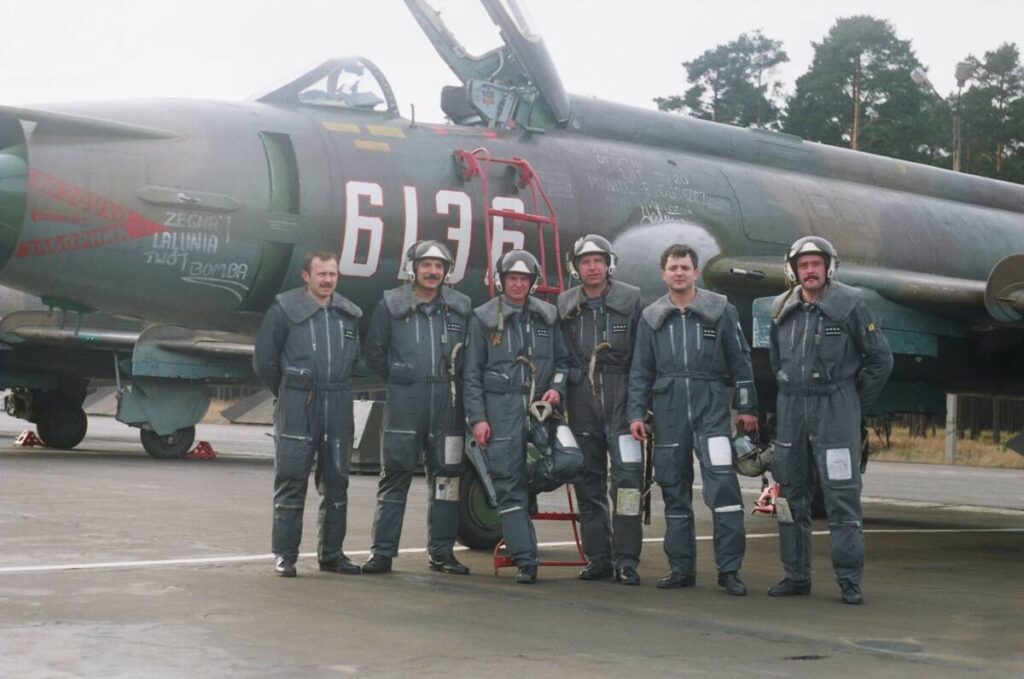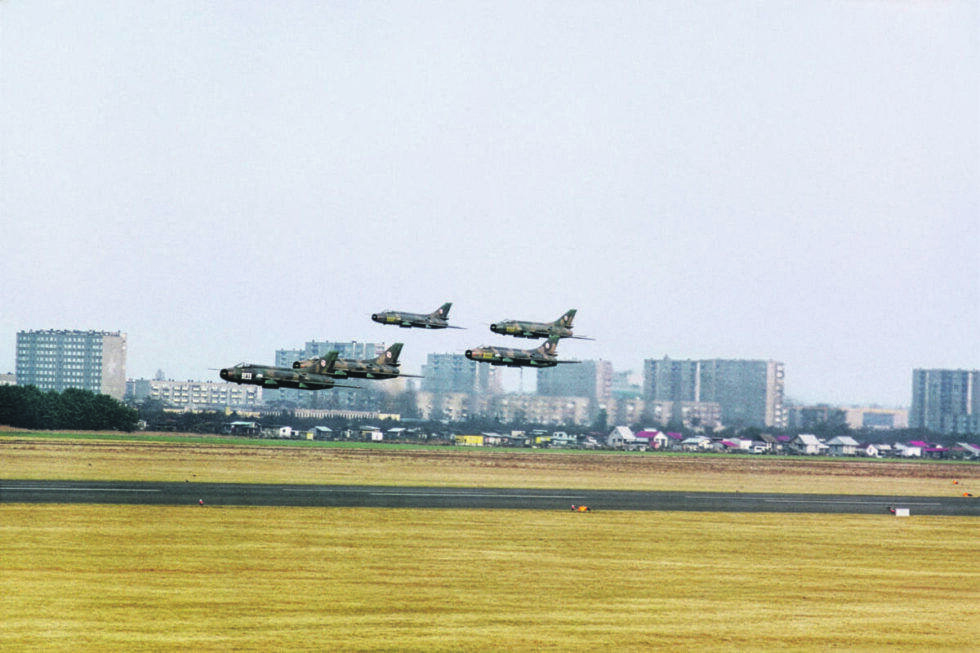 – Mam całą historię tego przylotu, samoloty uchwycone jak kołowały na pasie startowym. Zużyłem wtedy chyba z osiem negatywów, zdjęcia robiło się zwykłymi aparatami. Miałem wówczas Zenita, bardzo dobry aparat jak na tamte czasy. I uchwycić taki moment przelotu było bardzo trudno. Samoloty leciały z prędkością 400 km/h i był tylko jeden moment na „strzelenie” migawki, następne przesunięcie kliszy – i już tych Su-20 by nie było.