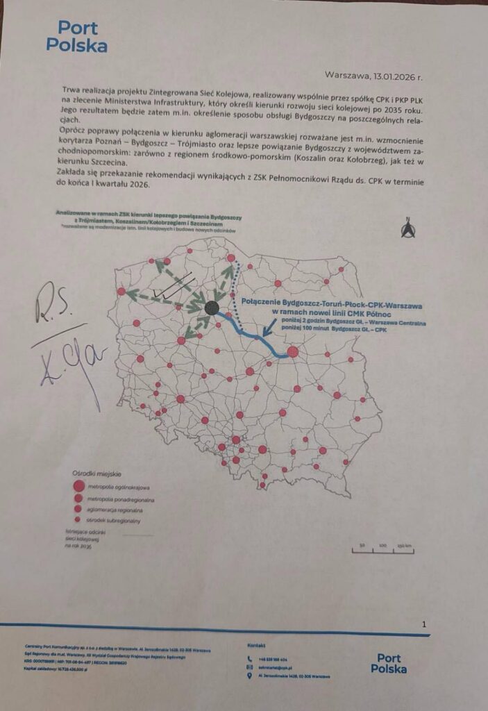 – Dwóch wicepremierów zarekomendowało Ministrowi Infrastruktury Dariuszowi Klimczakowi, że szybka kolej z i do Portu Polska powinna sięgać przez Toruń do Bydgoszczy oraz silniej związać Szczecin z resztą Ojczyzny – napisał w mediach społecznościowych Radosław Sikorski, wicepremier i Minister Spraw Zagranicznych. Na piśmie, który stanowi załącznik do wpisu widnieje również podpis drugiego wicepremiera związanego z Bydgoszczą, Krzysztofa Gawkowskiego.