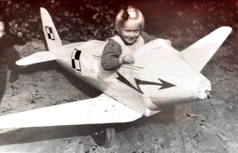 Nie jestem pewna, gdzie wykonane zostało to zdjęcie. Od osób w zbliżonym do mojego obecnie wieku słyszałam, że takie fotografie wykonywane były również przy Placu Wolności. Sceneria zdjęcia (tło) nie przekonuje mnie jednak o tym. W dodatku, jak przez mgłę pamiętam, że podobna „akcja” miała miejsce w przedszkolu, do którego uczęszczałam. Mieściło się ono w pięknym, starym, jednopiętrowym domu na Bielawkach, przy ul. Płockiej. Tu jestem swobodna i uśmiechnięta. Podobała mi się zapewne ta maskarada. A może mój pobyt w samolociku poprzedzały fotografie wykonane innym dzieciom z przedszkola i to mnie wprowadziło w dobry nastrój?