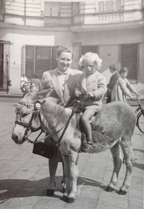 Na drugiej fotografii „z osiołkiem” towarzyszy mi moja piękna, zgrabna i młoda Mamunia. Jest uśmiechnięta i radosna, nowocześnie ubrana w szykowny, modny kostium i ma modne buty na wysokich obcasach. Dodaje mi odwagi, bo jak przypuszczam (znając siebie), sama (bez podpory fizycznej i duchowej) nigdy w życiu nie zdecydowałabym się wsiąść na osiołka, tzn. nikomu nie dałabym się na nim posadzić.