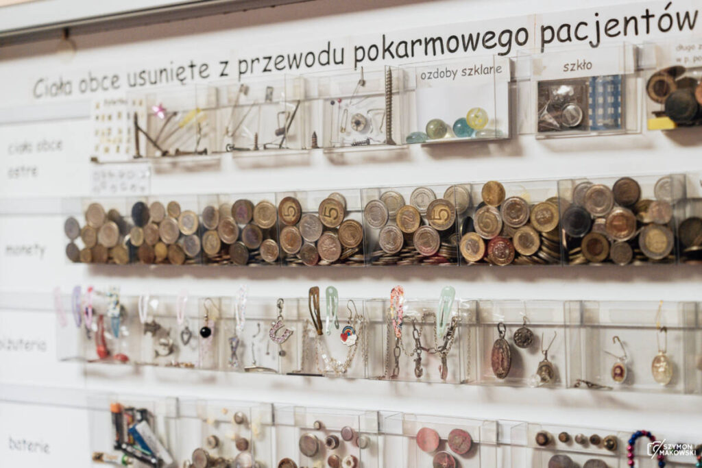 Dr. n. med. Julia Tworowska: – Kiedyś w wigilijny dyżur przywieziono do nas dziecko z połkniętą bombką, a za dwie godziny z ością, która utknęła w przełyku, więc zdarzają się takie „sezonowe interwencje”. W gablocie wyjętych ciał obcych, która znajduje się w korytarzu Zakładu Endoskopii, są monety, guziki, ale i plastikowe nogi Gargamela z jajek niespodzianek. Były one na tyle szerokie, że przy połykaniu utykały dzieciom w przełyku. I to nie był tylko jeden taki przypadek. W gablocie są dwie takie same pary zabawkowych nóg. Klinika prowadzi całodobowy dyżur endoskopowy. Przyjeżdżają do nas dzieci wymagające szybkiej interwencji, z całego naszego i sąsiednich województw.