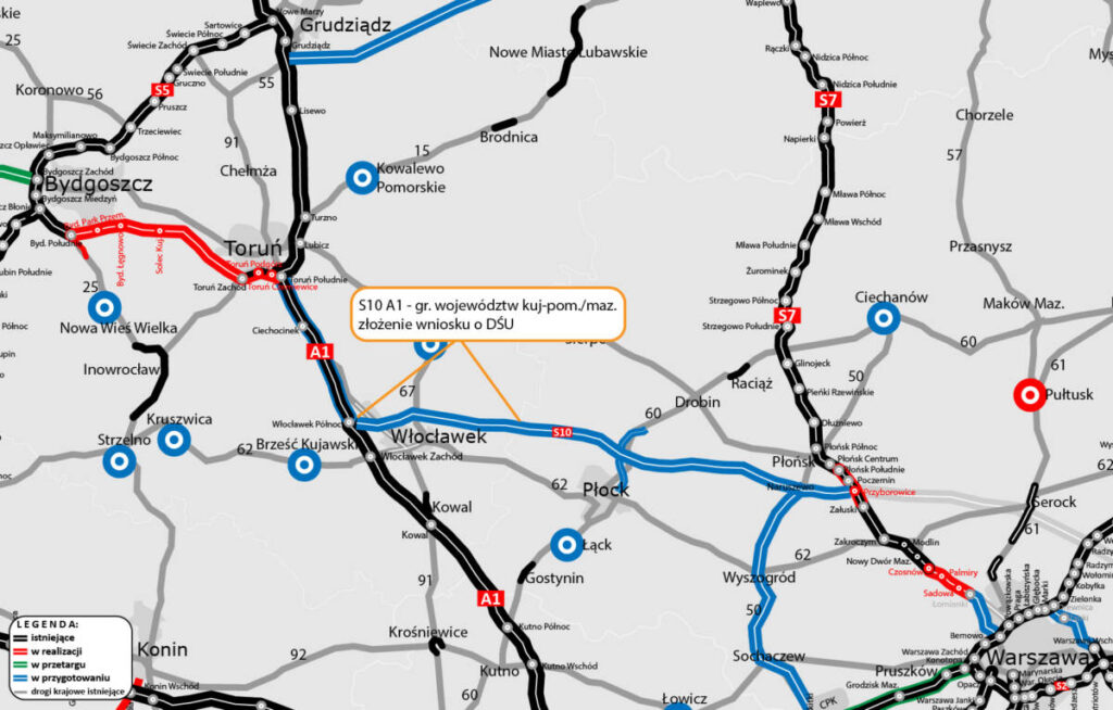 Bydgosko-toruńska ekspresowa S10 to tylko fragment całej trasy, która połączy Bydgoszcz ze Szczecinem na północnym zachodzie i Warszawą w centrum kraju. W sumie S10 to około 400 km. GDDKiA oczekuje obecnie na decyzje realizacyjne trasy od Włocławka do granicy woj. kujawsko-pomorskiego i mazowieckiego i dalej do stolicy. – Wtedy już nie będziemy musieli nadrabiać drogi do Warszawy jadąc A1 i A2 – dodał Sebastian Borowiak. To jednak perspektywa 10 lat.